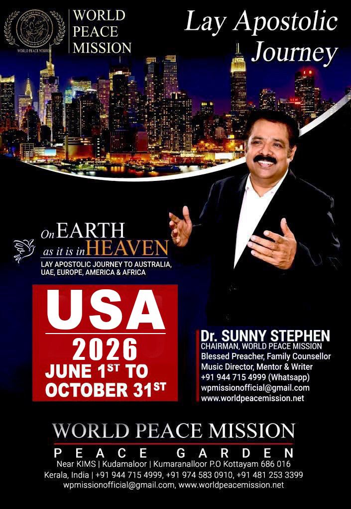 അറ്റ്ലാന്റാ : സുപ്രസിദ്ധ വചനപ്രഘോഷകനും, സംഗീത സംവിധായകനും, വേൾഡ് പീസ് മിഷൻ ചെയർമാനും, ഫാമിലി കൗൺസിലറുമായ ഡോ. സണ്ണി സ്റ്റീഫൻ,2026 ജൂൺ ആദ്യവാരം അമേരിക്കയിലെത്തുന്നു.